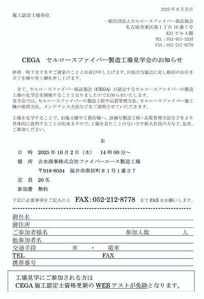 CEGA セルロースファイバー製造工場見学会のお知らせ(PDFファイル)